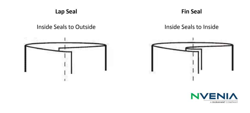 There are two common types of seals used: the lap seal and the fin seal. In a lap seal, the two edges of the film overlap and are sealed together, with the top side's back sealing to the front of the bottom side. A fin seal brings the film edges together inside the forming tube and sealing the inner surfaces.