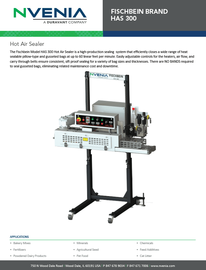 Our Fischbein Brand HAS 300 Hot Air Sealer is a heavy duty, high-production sealing system that efficiently closes a wide range of heat sealable pillow-type and gusseted polyethylene bags at up to 60 linear feet per minute.