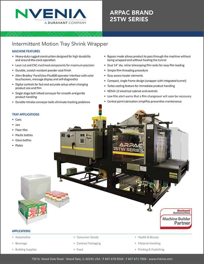Our Arpac Brand 25TW Model is an intermittent motion tray wrapper capable of wrapping up to 25 products per minute, depending on product size. It’s rugged design ensures years of reliable service.