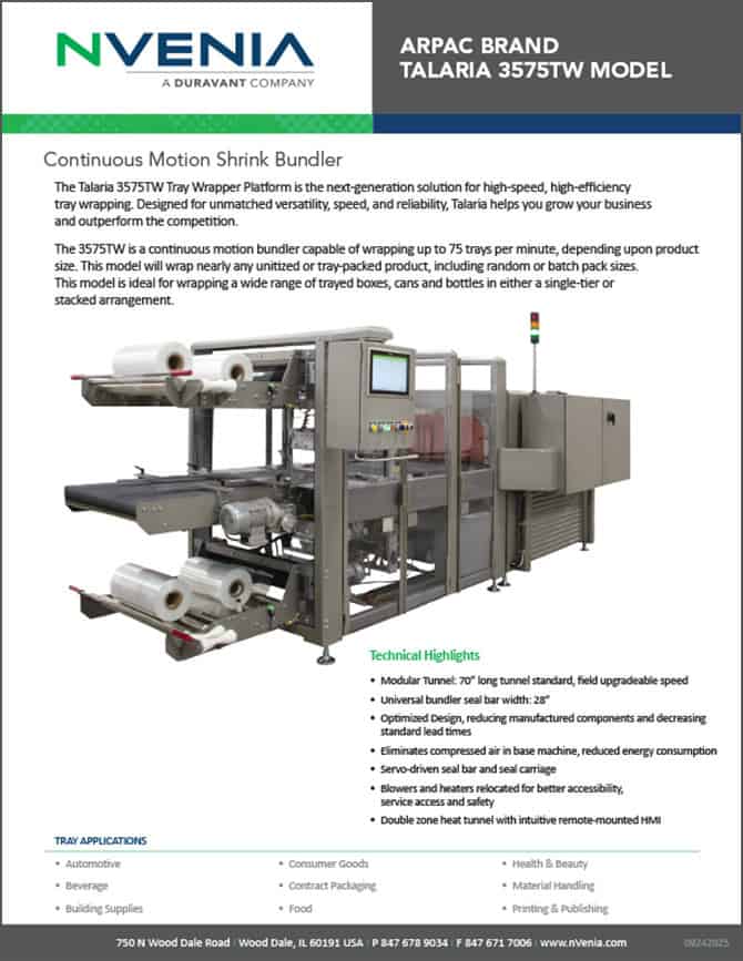 The 3575TW is a continuous motion bundler capable of wrapping up to 75 trays per minute, depending upon product size. This model will wrap nearly any unitized or tray-packed product, including random or batch pack sizes. This model is ideal for wrapping a wide range of trayed boxes, cans and bottles in either a single-tier or stacked arrangement.