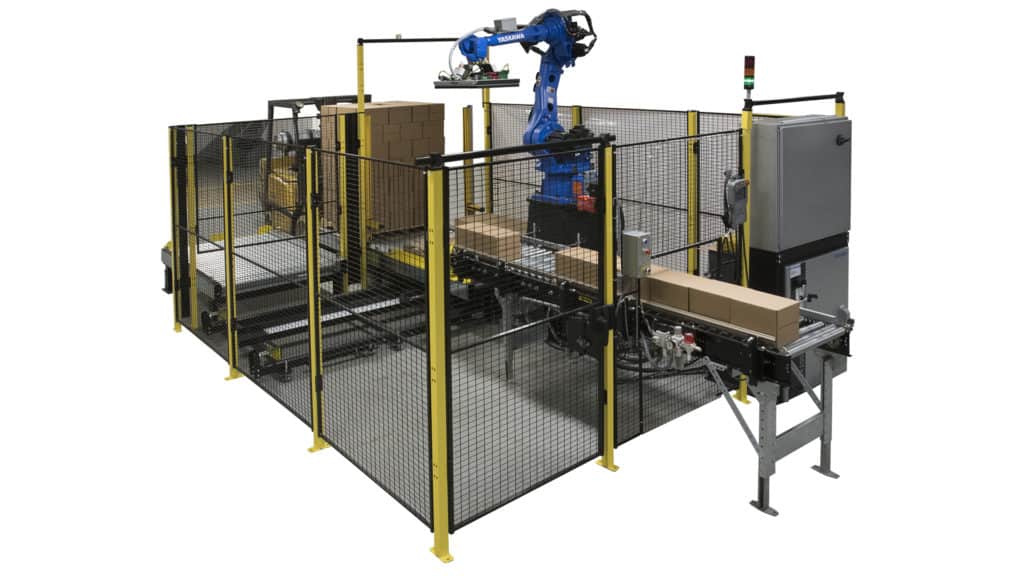Our Arpac Brand Robotic Palletizer Model is a pre-engineered robotic palletizing cell that automatically stacks and wraps pallets to exact specifications. It consists of a multi-axis robot, end of arm tool, automatic stretch wrapper, pallet dispenser and conveyance system within a space efficient footprint. Palletizer cells range from a one-line in/one-line out configuration, up to a four-line in/four-line out configuration to match your application needs.