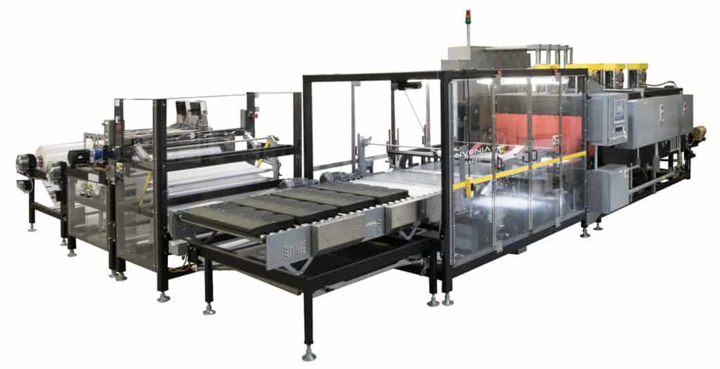 - Integrated shrink tunnel with a triple turbo cooling unit expedites film curing and stabilizes product in the package as it cools