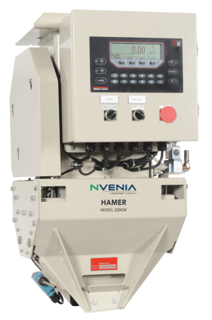 Our Hamer Model 100GW Gross Weigh Bagging Scale introduces next-generation technology to gross weigh bagging and filling. This bagging scale is used for semi-automatic filling of free-flowing granular products such as seed, feed, grains, dry sand, salt and others. A unique bag in place window allows operators to visually confirm bag is properly placed before filling. The Model 100GW has a compact design fits easily into most production applications. The unique dual load cell design eliminates inaccuracies inherent in single load cell scales. This particular gross weigh scale is fast, accurate, and easy to use.