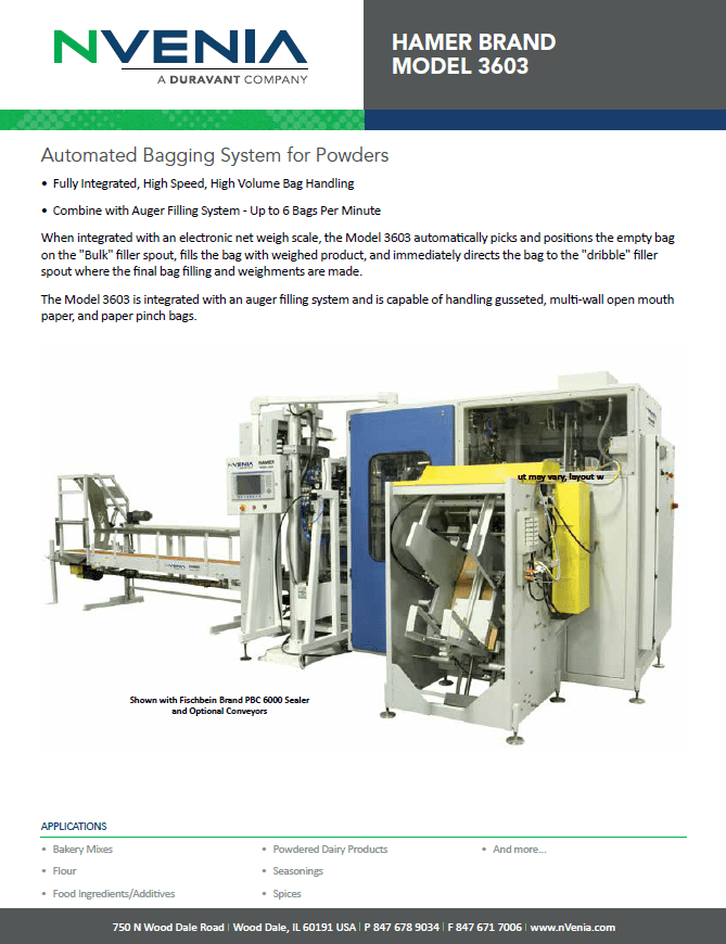 The Hamer Model 3603 Automated Bagging System provides fully automatic bag hanging and transfer for pre-made open-mouth gusseted style, multi-wall paper and paper pinch bags. The Model 3603 automated bagging system automatically picks and positions the empty bag on the “bulk” filler spout, fills the empty bag with product and immediately guides the bag to the “dribble” filler spout where the final bag filling and weighment are made. The Model 3603 is integrated with an auger filling system and is capable of handling a wide variety of powder products.