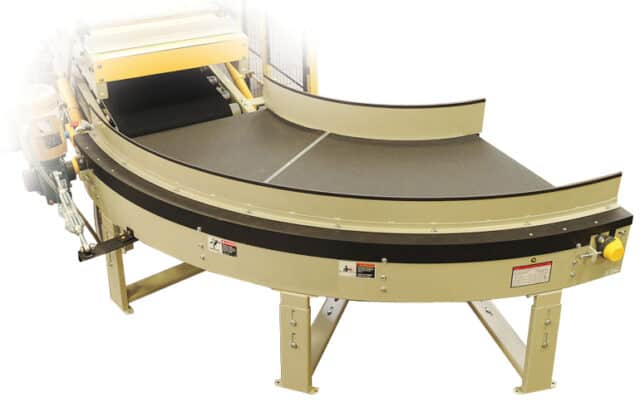 Our Hamer Model 4300 Belt Power Curve Bag Conveyor is used to transport and turn bags around a 90 degree curve. Available in 19”, 24” and 30” widths with a standard height of 36”.