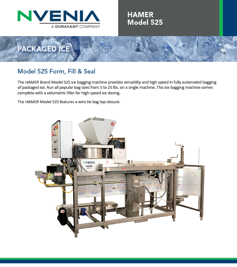 Our Hamer Model 525 Ice Bagging Machine provides versatility and high speed in fully automated bagging of packaged ice. Run all popular bag sizes from 5 to 25 lb. on a single machine.