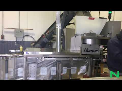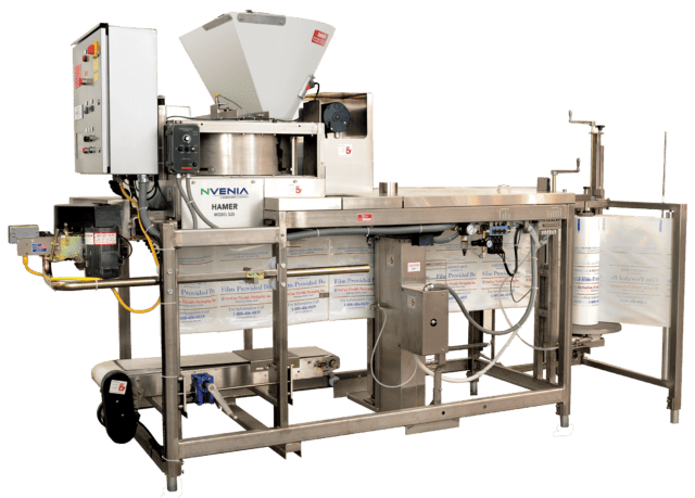 Our Hamer Model 525 forms a bag from a preprinted centerfold low density polyethylene film. The bag is then opened allowing it to be filled and sealed with a wire tie bag top closure, sold separately. Forming the bag in process yields up to 20% savings in cost and storage space and eliminates product spills and bag waste. The compact horizontal design accommodates installations with low overhead space and under existing equipment. It includes a 304 stainless steel volumetric feeder with food grade UHMW hopper and lining.