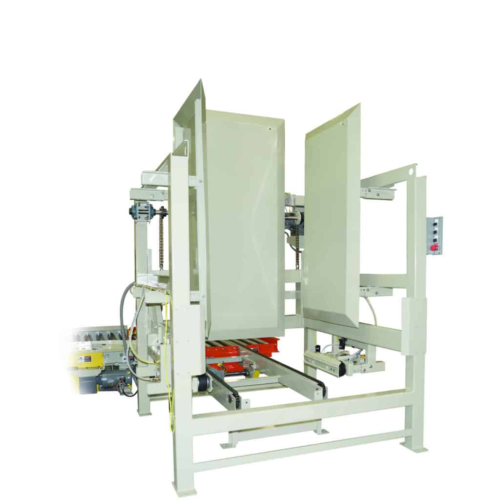 Our Hamer Brand Pallet Dispenser ensures that pallets are consistently fed to the bag palletizing station as part of an automated palletizing system.