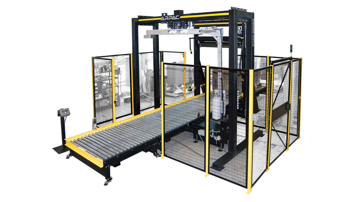Our Hamer Brand Pallet Dispenser ensures that pallets are consistently fed to the bag palletizing station as part of an automated palletizing system.