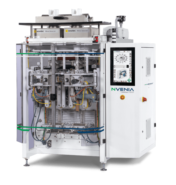 The nVenia Storm Series dual-tube Continuous Motion Vertical Form, Fill & Seal (VFFS) Machines produce ultra-high-speed pillow and side-gusset bags at up to 390 bags per minute. The dual-tube design delivers twice the capacity of a single-tube machine in the same footprint.
