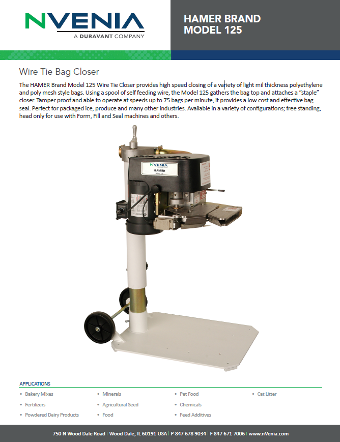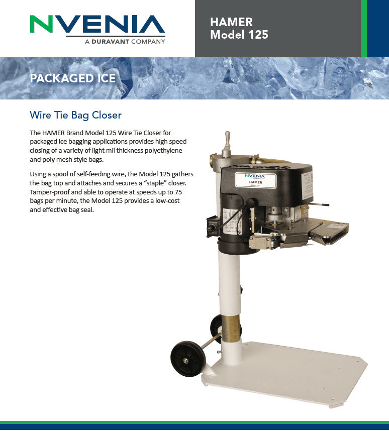 Our HAMER Brand 125 Wire Tie Closer provides high speed closing of a variety of light mil thickness polyethylene and poly mesh style bags. Using a spool of self feeding wire, the HAMER Brand 125 gathers the bag top and attaches a “staple” closer. Tamper proof and able to operate at speeds up to 75 bags per minute, it provides a low cost and effective bag seal. Perfect for packaged ice, produce and many other industries. Available in a variety of configurations; free standing, head only for use with Form, Fill and Seal machines and others.